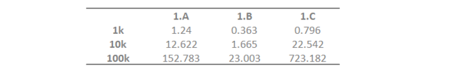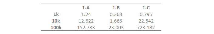 As seen from the table, method B is the fastest, while method C is the slowest.