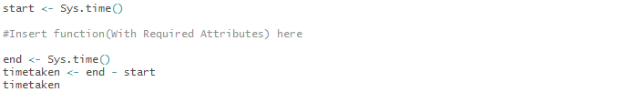 Moving right along, let’s do a performance evaluation of each of these methods. Here’s a snippet code that can help us calculate time taken for the data to process through the function and throw out an output:
